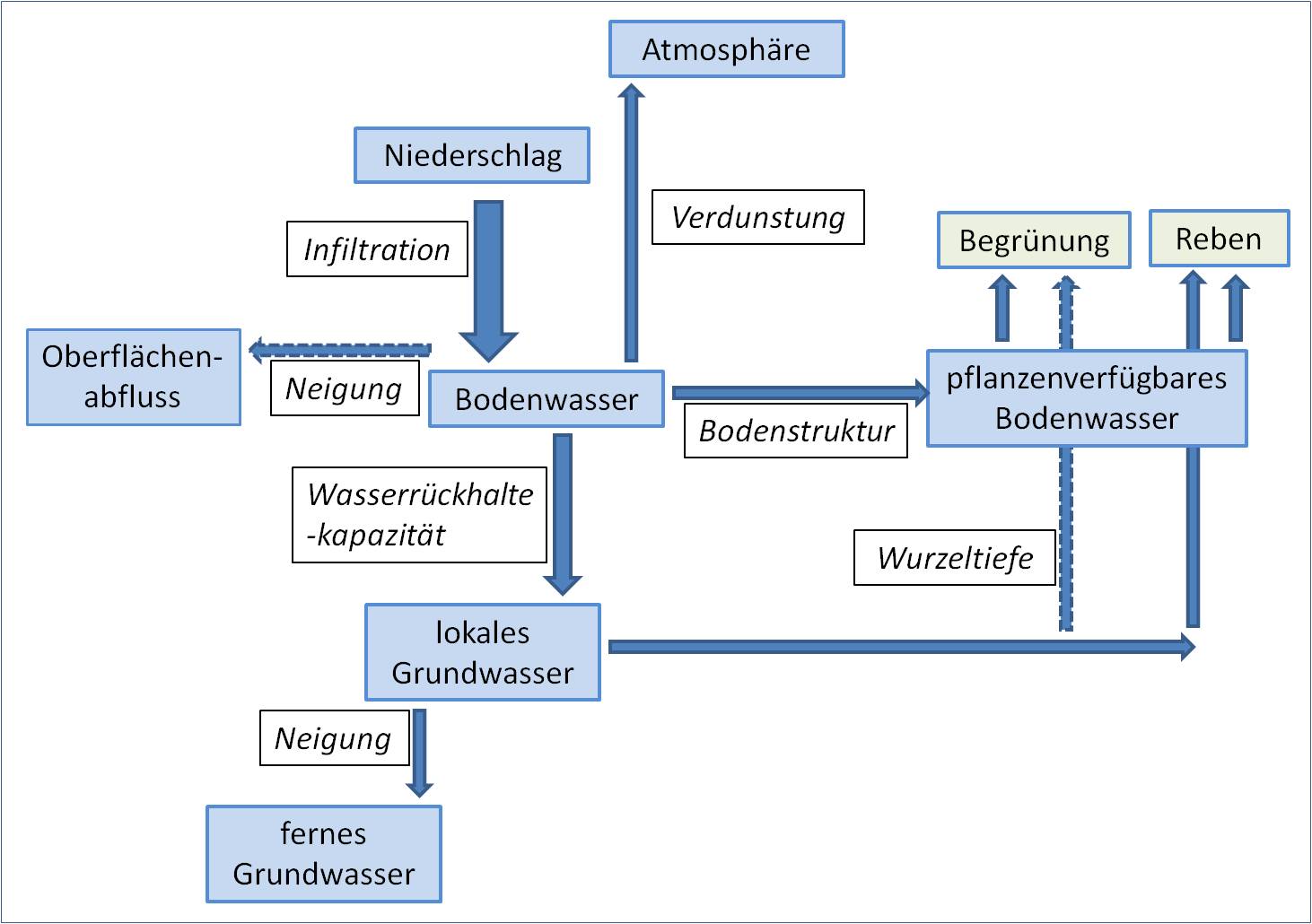 Abb.3 Vereinfachte Darstellung der Wasserflüsse im begrünten Weinberg. In kursiv die Hauptfaktoren, welche quantitativ Einfluss nehmen.