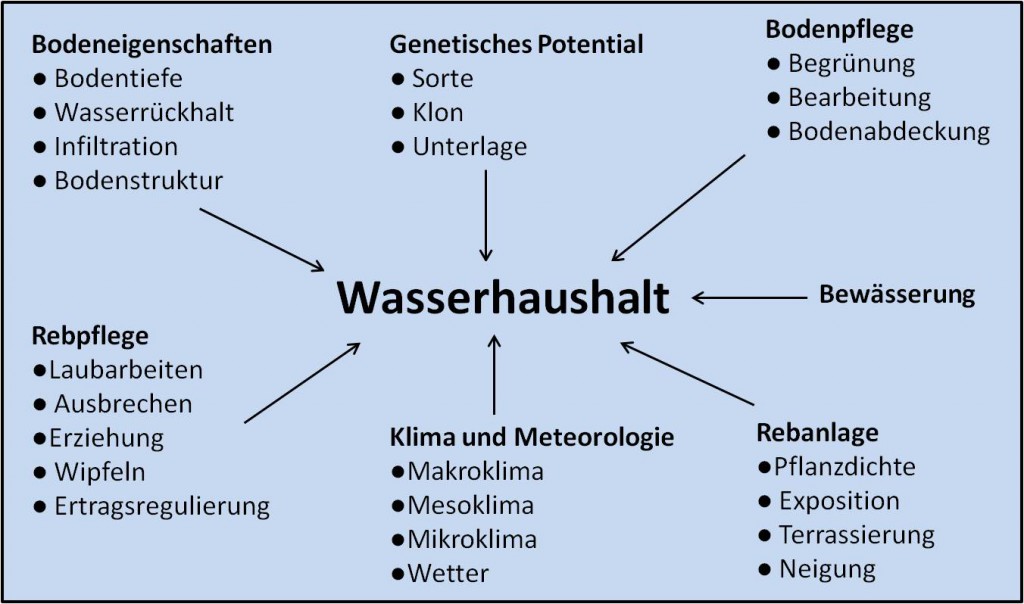 Ausgeprägte Trockenphasen stellen zwar nicht grundsätzlich ein Problem für die Rebe dar, denn sie ist ein genügsamer Organismus. Doch wenn in den entscheidenden Wachstumsphasen zu großer Wasserstress herrscht, wirkt sich dies negativ auf die Qualität und auf die Erntemenge aus. Auch ein Zuviel an Wasser zum falschen Zeitpunkt führt zu verminderter Traubenqualität.  Zudem ist angesichts der drohenden Verknappung der Ressource Wasser in vielen Gebieten eine Bewässerung nicht nachhaltig möglich. Für ein ökologisches Qualitätsmanagment im Weinbau ist eine optimierte Wasserwirtschaft daher von größter Wichtigkeit. Das Gleichgewicht zu finden, ist eine anspruchsvolle Aufgabe, da dieses von unzähligen, in der folgenden Abbildung dargestellten Faktoren beeinflusst wird (Abb.1).