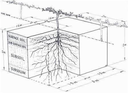 Die Weinrebe zeichnet sich durch verschiedene Eigenschaften aus, welche es ihr ermöglichen, den Wasserverbrauch zu drosseln und auch in Phasen ohne Niederschläge noch produktiv zu sein. Durch ihr tief reichendes Wurzelwerk gelingt es ihr, Feuchtigkeit nicht nur aus allen Bodenschichten zu beziehen, sondern auch Grundwasser oder absickerndes Hangwasser zu erreichen (Abb.2). Die Blätter, das Hauptorgan der Verdunstung, sind durch feine Filzhaare geschützt, welche die Wirkung der Sonneneinstrahlung eindämmen und Luftströmungen über dem Blatt bremsen, wodurch die Transpiration vermindert wird. Auch die dünne Wachsschicht (Cuticula), welche das Blatt überzieht, kann durch ihre wasserabweisende Struktur unproduktive Transpiration verringern. Zudem besitzt die Weinrebe einige physiologische Steuerungsmechanismen, welche ihr einen effizienten Umgang mit der Ressource Wasser erlauben. Bei suboptimaler Versorgung wird als erstes die Neubildung von Zellen eingeschränkt, was bedeutet, dass die Rebe kaum oder nur noch langsam weiter wächst. Nimmt der Wasserstress zu, werden weitere aufbauende Prozesse im Stoffwechsel gedrosselt. Erst bei noch stärkerem Wasserstress werden die Spaltöffnungen vermehrt geschlossen und die Photosynthese-Aktivität reduziert. Das heißt, dass bei gemäßigt suboptimaler Wasserversorgung (rund 60 % bezogen auf das nutzbare Maximum) zwar kaum mehr Wachstum möglich ist, aber trotzdem noch Assimilate wie Zucker produziert und in die Trauben eingelagert werden können. Die Pflanze stellt ihre Investitionen von Wachstum auf die Ausbildung und Reifung der Trauben um.
